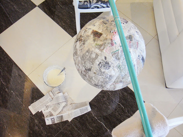 Если шар большого диаметра, как в моем случае, то два последних слоя можно делать не из полосок, а из больших газетных листов. Главная задача - сделать довольно плотный шар, но который все-таки можно разбить.